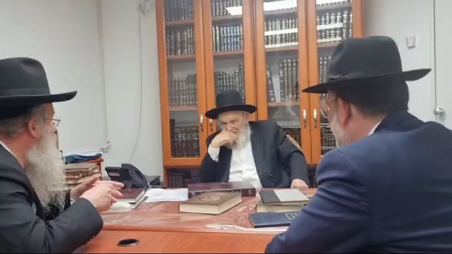 יו"ר סיעת 'יהדות התורה' ח"כ יצחק פינדרוס ויד ימינו מוישי רבר; ושמוליק ליטוב מנכ"ל עיריית בני ברק היוצא - בסוד שיח עם הרב יעקב קנייבסקי, בשולי שמחת חתונת אחותו.