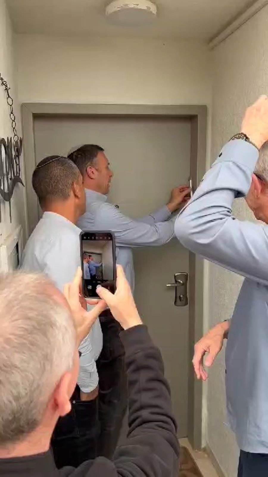 חבר הכנסת מתן כהנא מ'המחנה הממלכתי', בקביעת מזוזה בביתו החדש של יו"ר המפלגה השר בני גנץ, שעבר להתגורר בקיבוץ יד מרדכי בדרום בעקבות אירועי ה-7 באוקטובר.