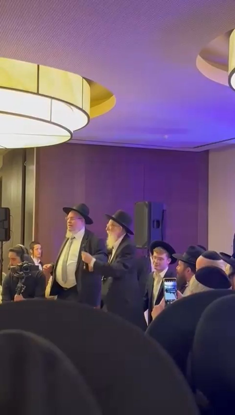 שר האנרגיה והתשתיות אלי כהן מ'הליכוד' ושר הרווחה יעקב מרגי מש"ס, בשמחת החתונה לנכדתו של הרב יעקב גלויברמן מבכירי העסקנים בחב"ד.