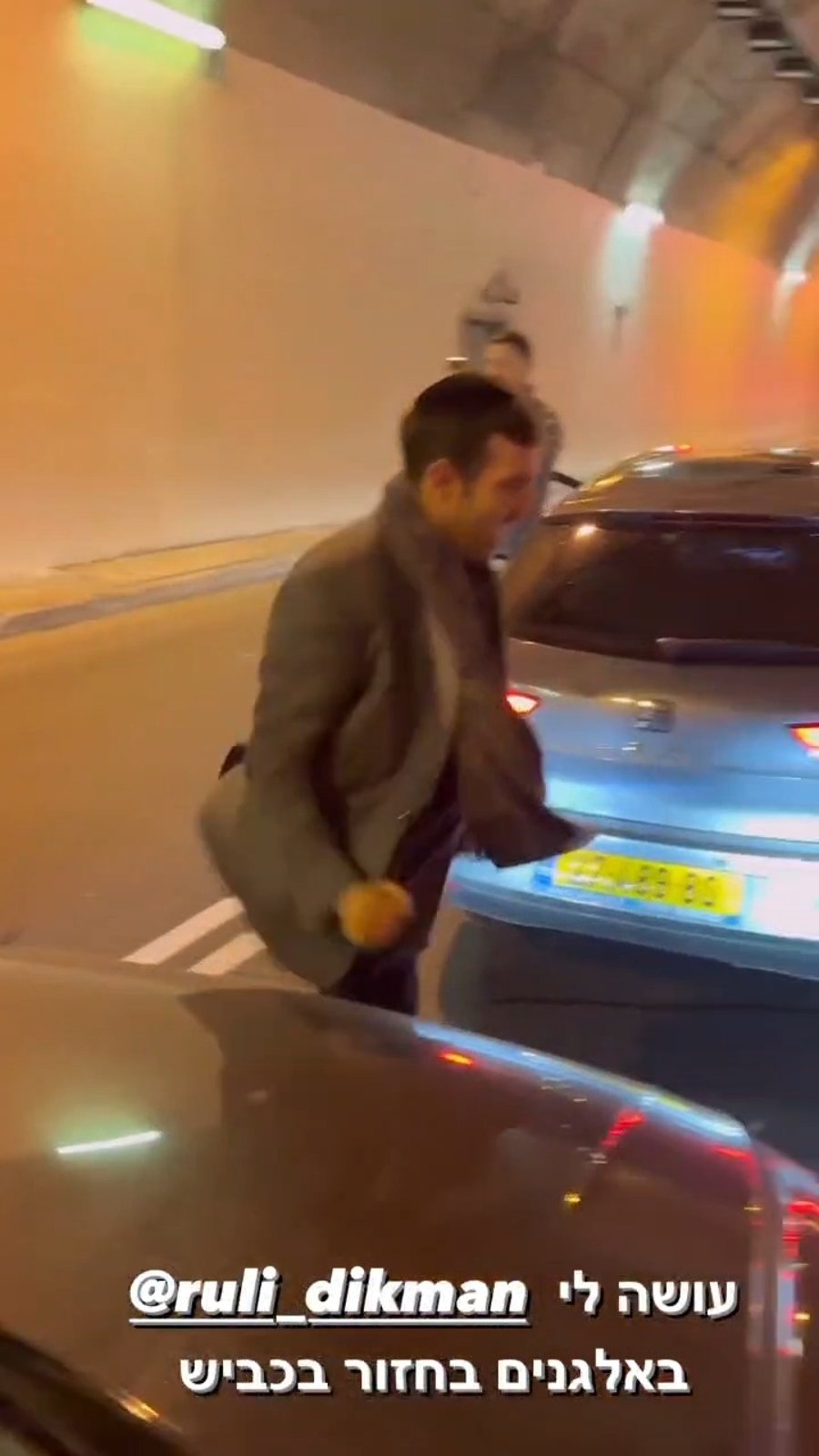 הזמרים רולי דיקמן וקובי ברומר נתקעו בשעת לילה בפקק ענק בכביש 1 בעקבות הפגנה נגד מעבר סיוע הומניטרי לעזה - ופצחו בריקוד ספונטני לצלילי המכוניות הצופרות.
