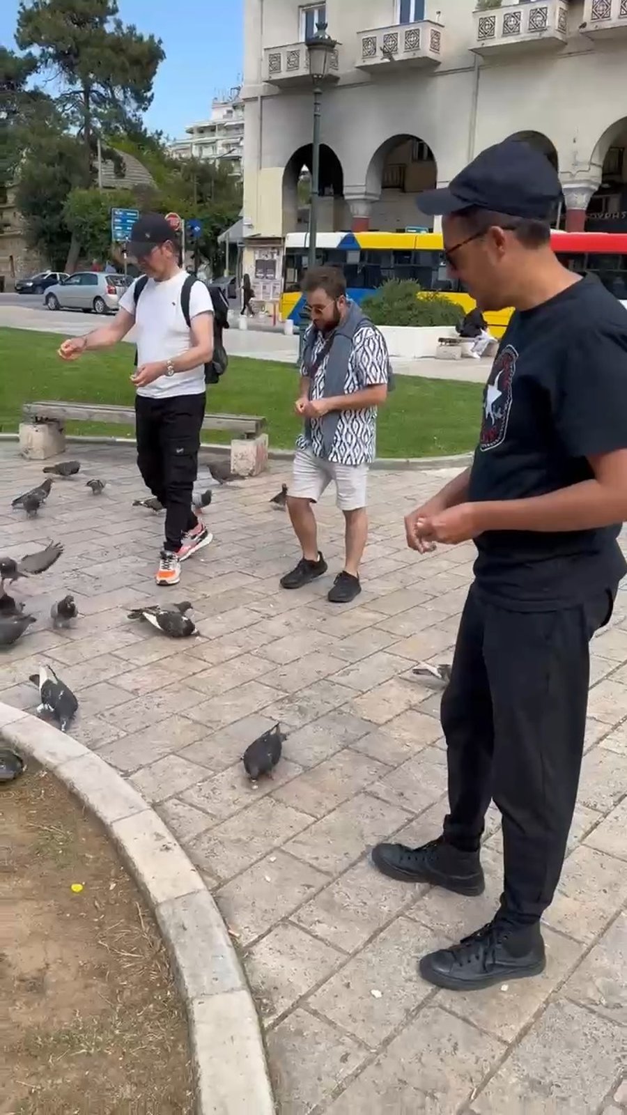 משעשע! הזמרים ישי לפידות ואריק דביר משתעשעים עם יונים במהלך חופשה ביוון. 'זופניק' מקווה שהם לא הביאו להם עלה קטן.