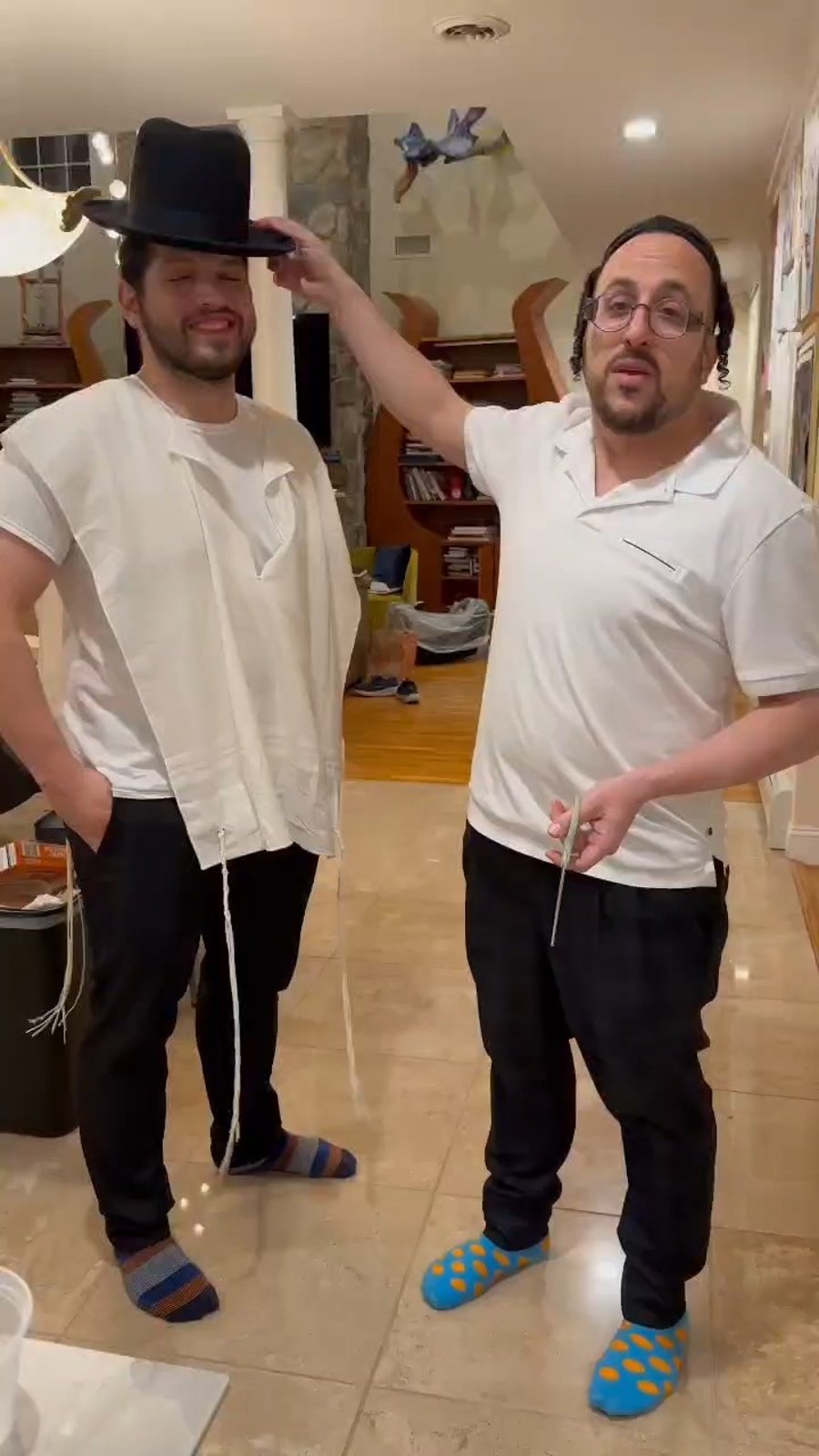 כשבועיים לפני החתונה והמעבר למגבעת חדשה - הזמר ליפא שמלצר גוזר את המגבעת הישנה של בנו החתן.