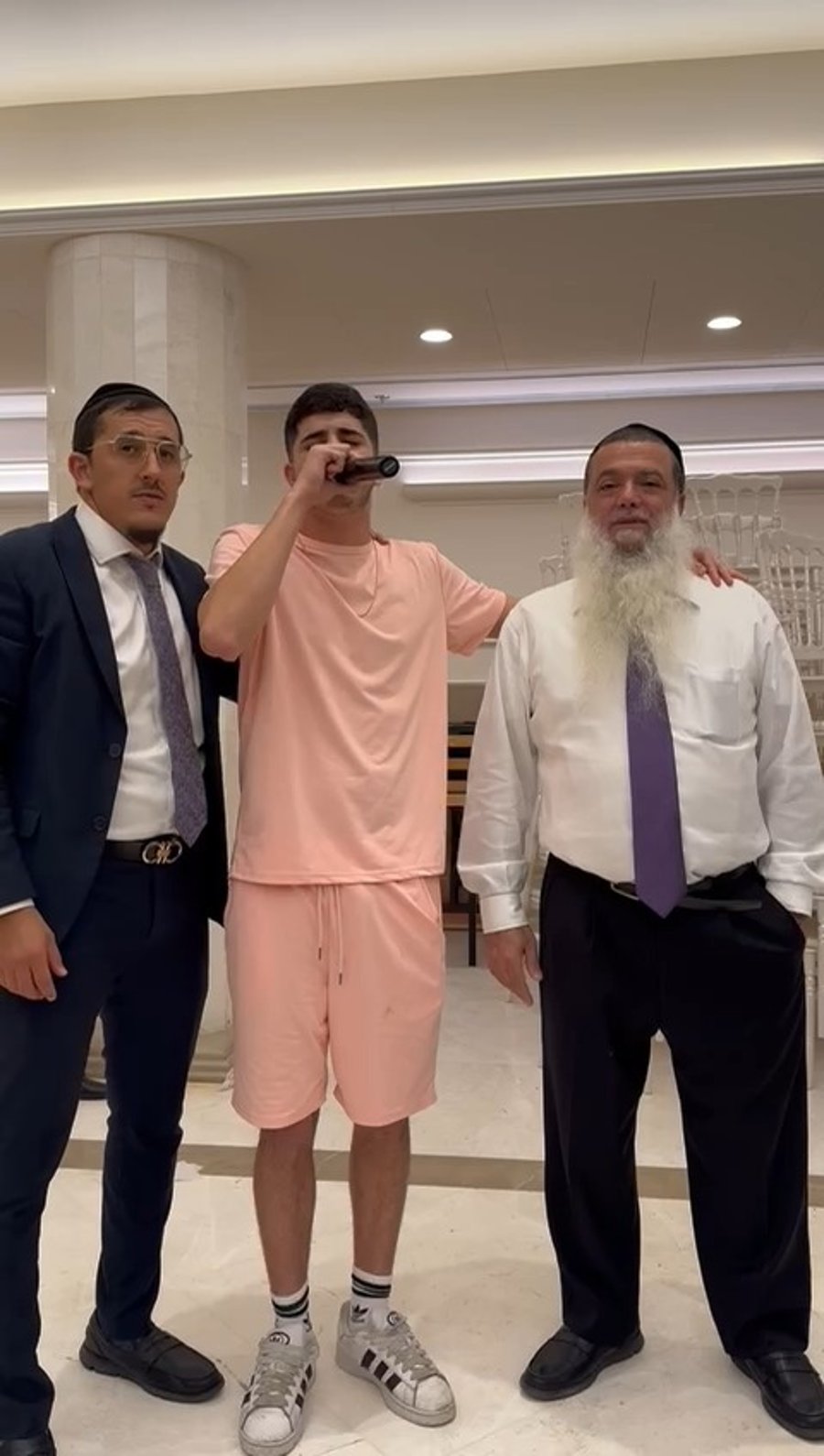 הזמר עילאי אלמקייס בשירה עם כיפה לראשו בסעודת מלווה מלכה יחד עם מזכה הרבים הגאון הרב יגאל כהן ראש מוסדות 'יביע אומר' והרב יהונתן פרטוש.