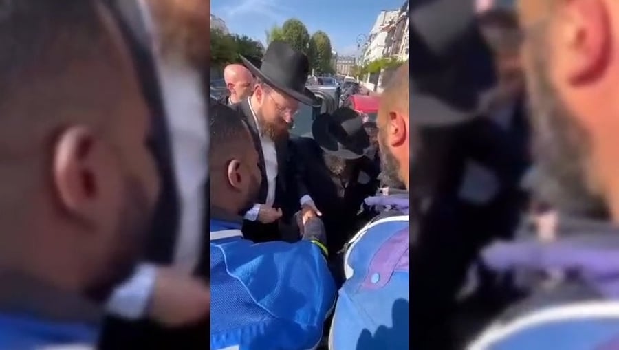 מנהיג הציבור הליטאי הגאון רבי דב לנדו, מברך את השוטרים המקומיים בצרפת לאחר שליוו אותו בשיירה מאובטחת למעמד האדיר עבור 'קרן עולם התורה' בפריז.