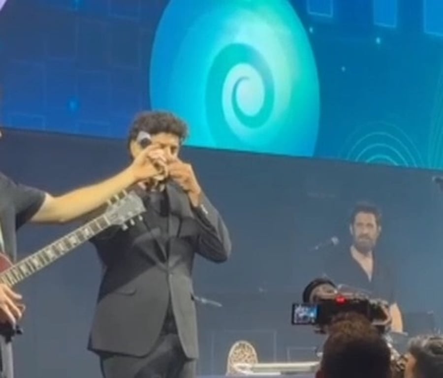 השחקן אביב אלוש בתקיעת שופר במהלך מופע של הזמר עידן רייכל לעובדי בית החולים 'אסותא' באשדוד.