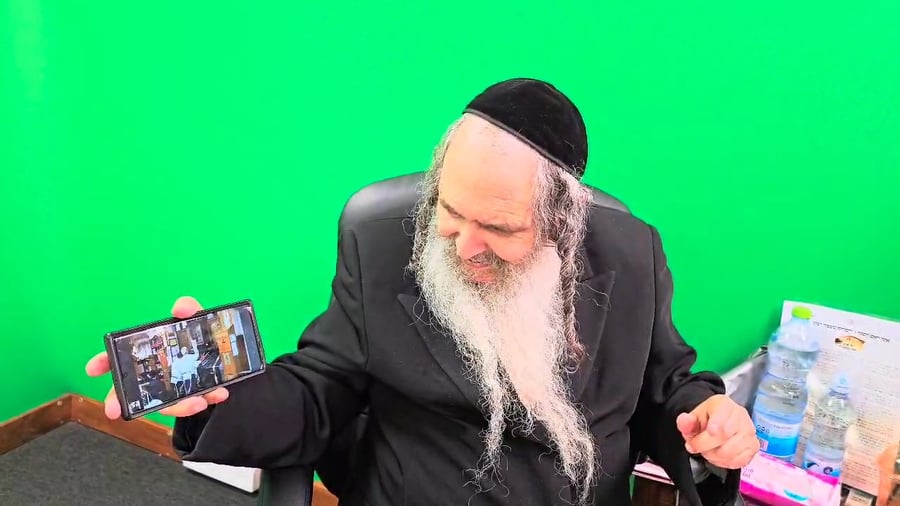 הגאון רבי אברהם מויאל ראש מוסדות 'אש החיים' בניו יורק מביט בהתפעלות באתרוג מהודר שקיבל מידידו הרב אריה קנייבסקי.