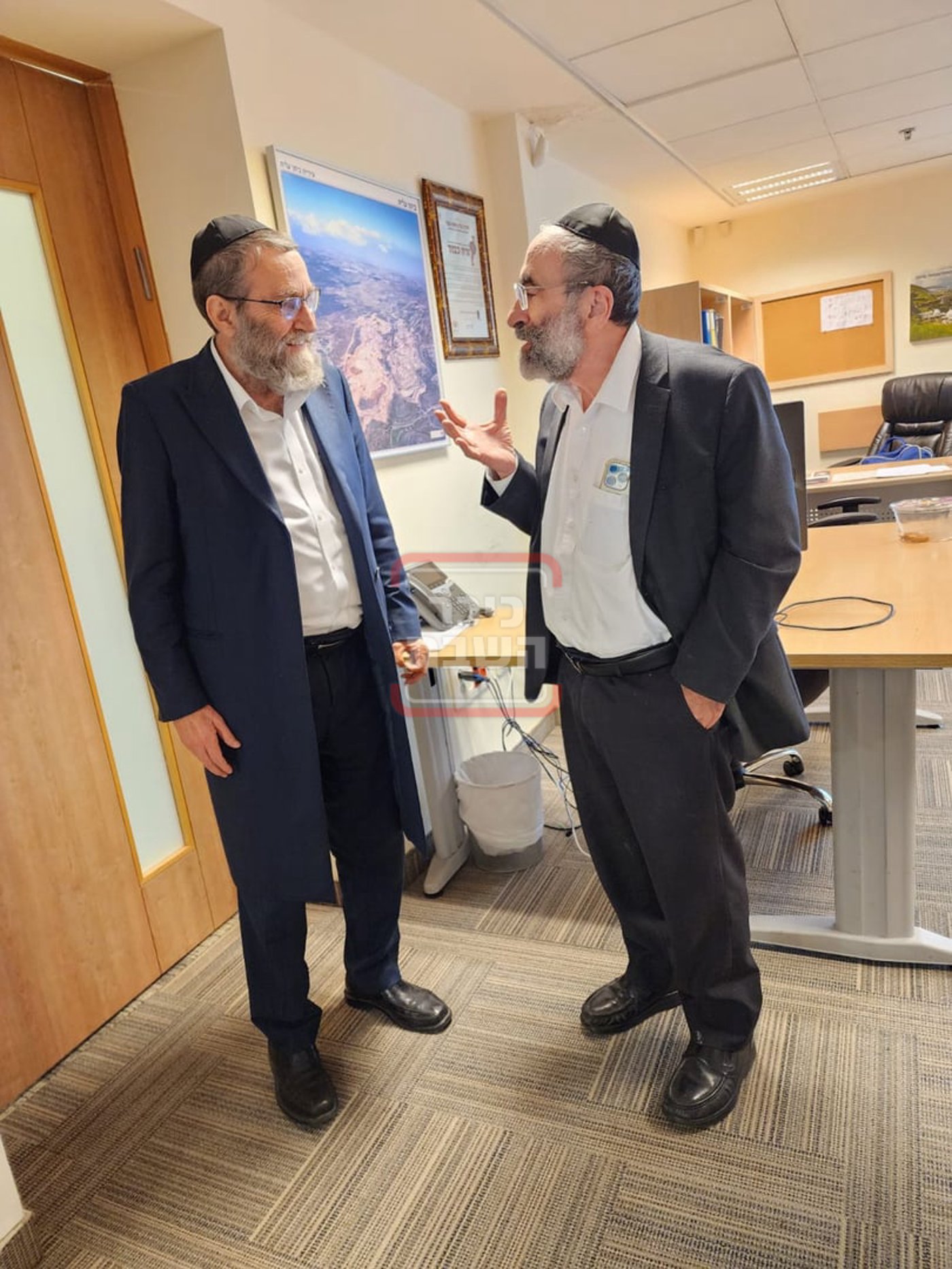מאיר שפיגלר מנכ"ל חברת החשמל בשיחת מסדרון בכנסת עם יו"ר ועדת הפנים ח"כ יעקב אשר מ'דגל התורה'.