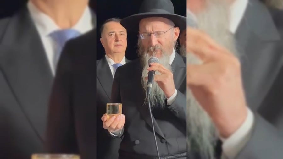 הזמר יודי ביאלוסטוצקי בסוד שיח עם הגאון רבי שלום בער סורוצקין ראש מוסדות 'עטרת שלמה', בחתונה יוקרתית בארצות הברית.