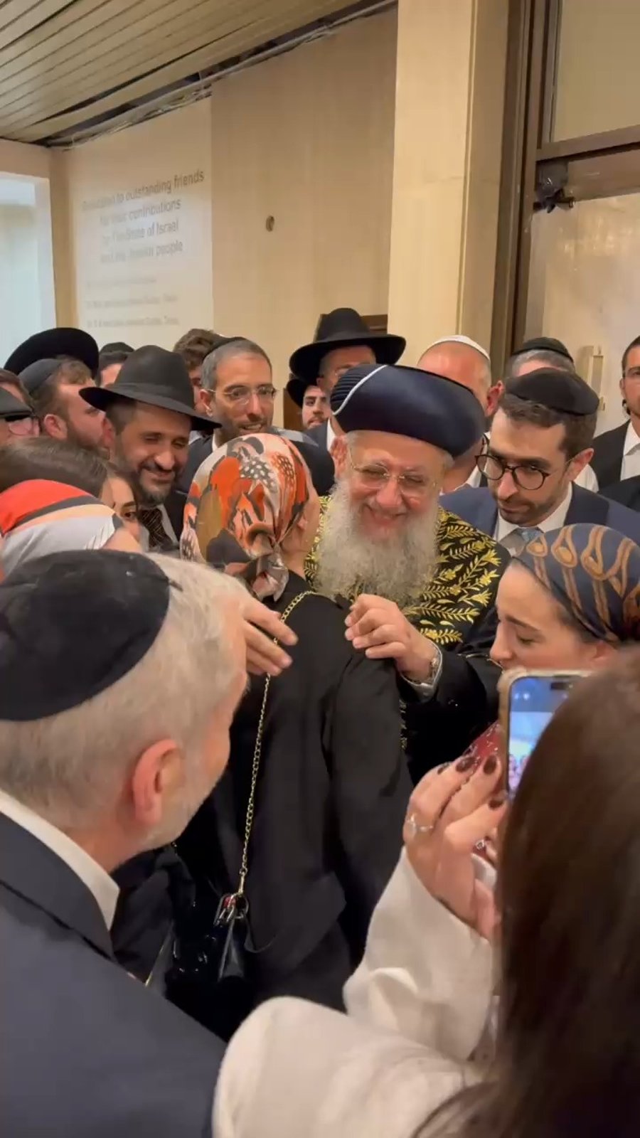 הראשון לציון הגאון רבי דוד יוסף מברך בקורת רוח רבה את בני משפחתו לאחר טקס ההכתרה בבית הכנסת הגדול בירושלים.