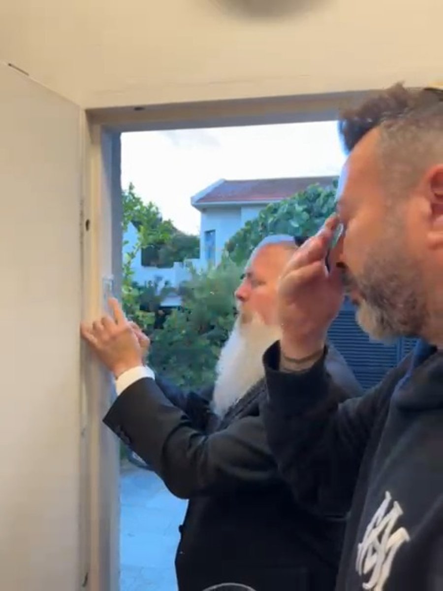 הרב שמואל ביסטריצקי רבה של סביון, בקביעת מזוזה באולפן ההקלטות החדש של הזמר ליאור נרקיס.