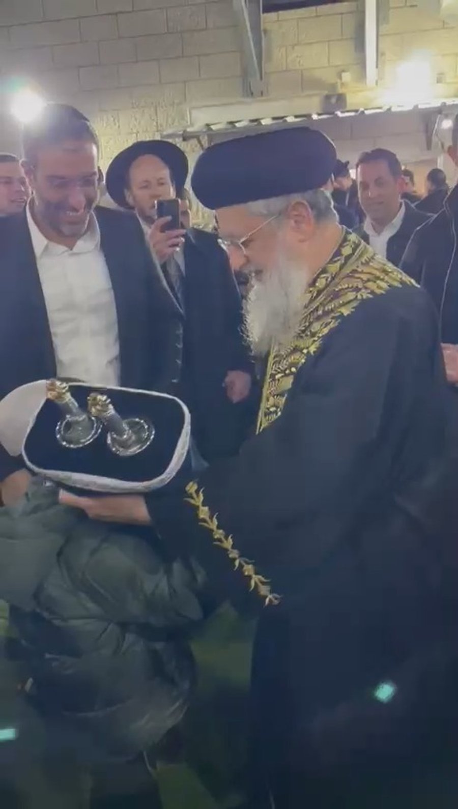 הראשון לציון הגאון רבי דוד יוסף רוקד בהכנסת ספר תורה לתלמוד תורה 'בית רבן' עם נכדו איתי שטיינברגר.