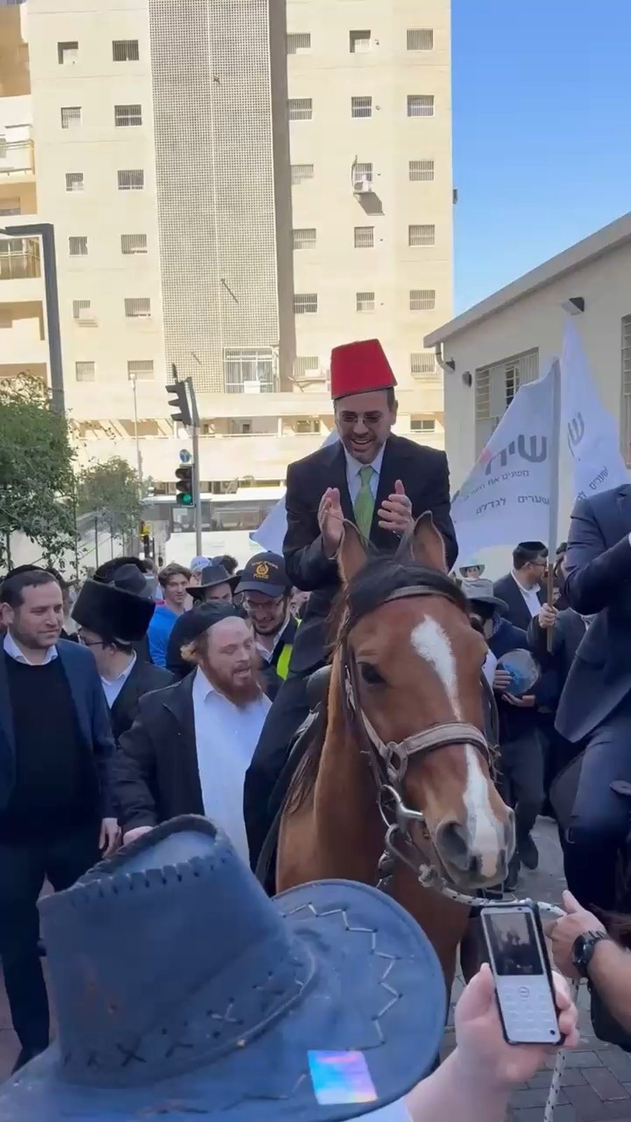 עם ג'לבייה ותרבוש, המשפיע הרב יעקב גלויברמן מחב"ד והסטנדאפיסט ישראל קטורזה בצילומים לתכנית פורים ב'ערוץ הספורט'.