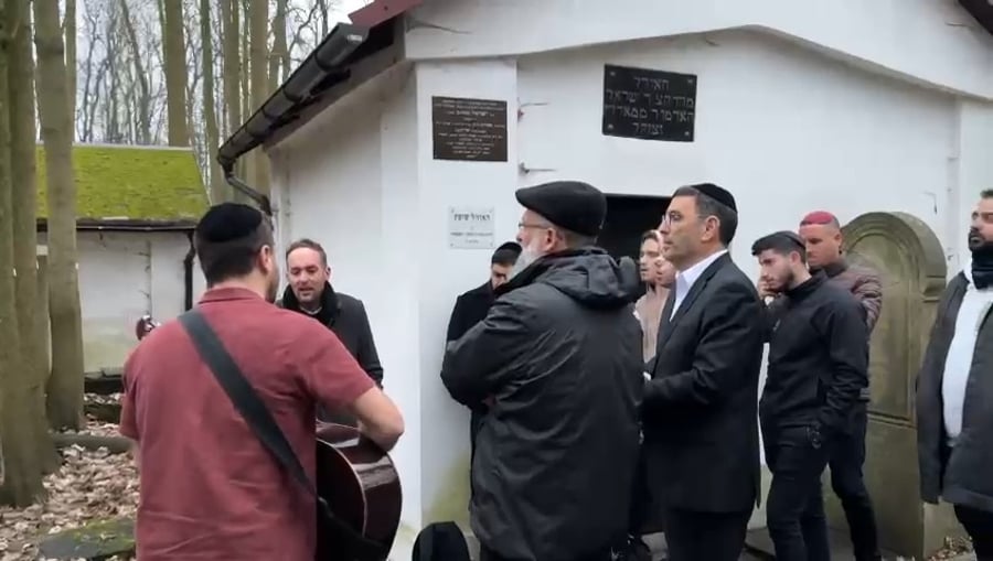 העיתונאי שלומי גיל מעיתון 'משפחה' בשירת "אני מאמין", עם תלמידי ישיבת ההסדר 'בצוותא', על ציונו של האדמו"ר ממודז'יץ בבית העלמין העתיק בוורשה, במסגרת מסע במחנות השואה בפולין.