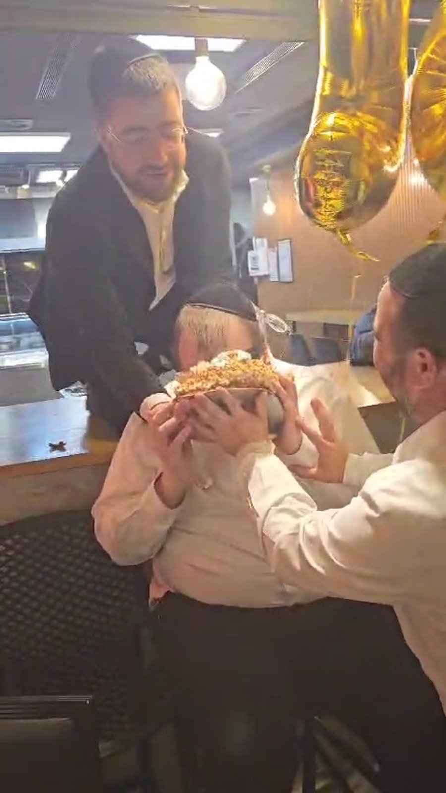 מי שארגן את השמחה הגדולה והצליח לשמור על הפתעה מוחלטת, הבחור החשוב יוסף שלמה יעקבזון, חברו הטוב של החתן משכבר הימים בעבר ובעתיד, לא ויתר על המתנה - עוגת קצפת היישר לפרצוף של החתן.