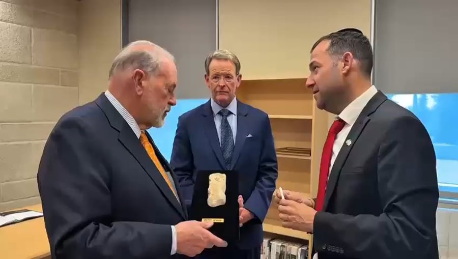 יוסי דגן ראש מועצת שומרון בקביעת מזוזה מאבני השומרון, בלשכתו של מייק האקבי שגריר ארצות הברית בישראל.