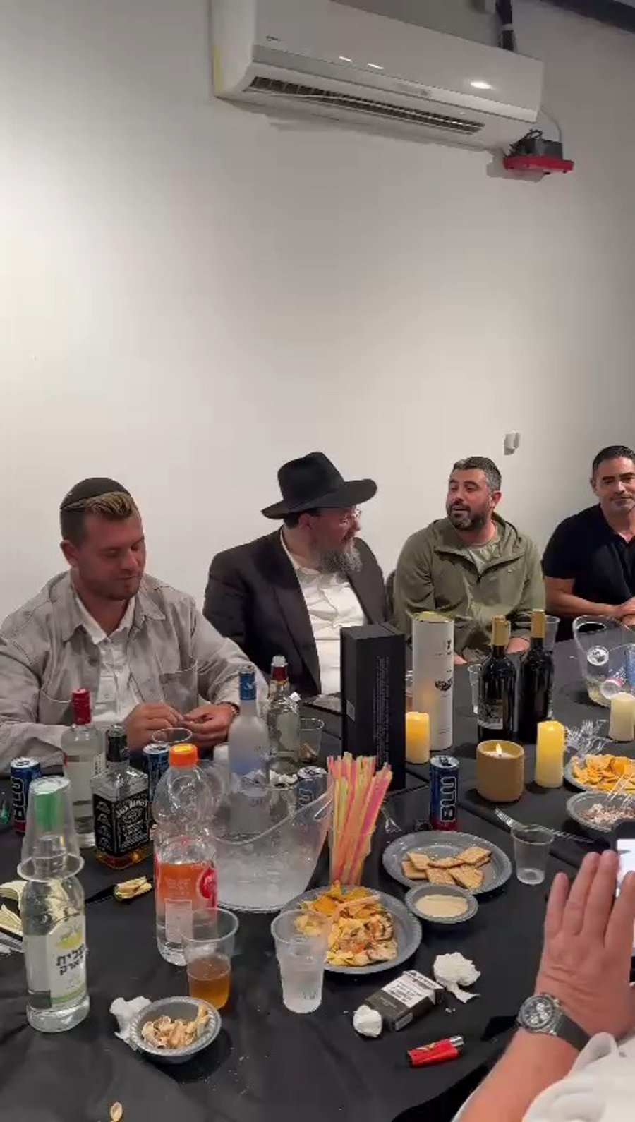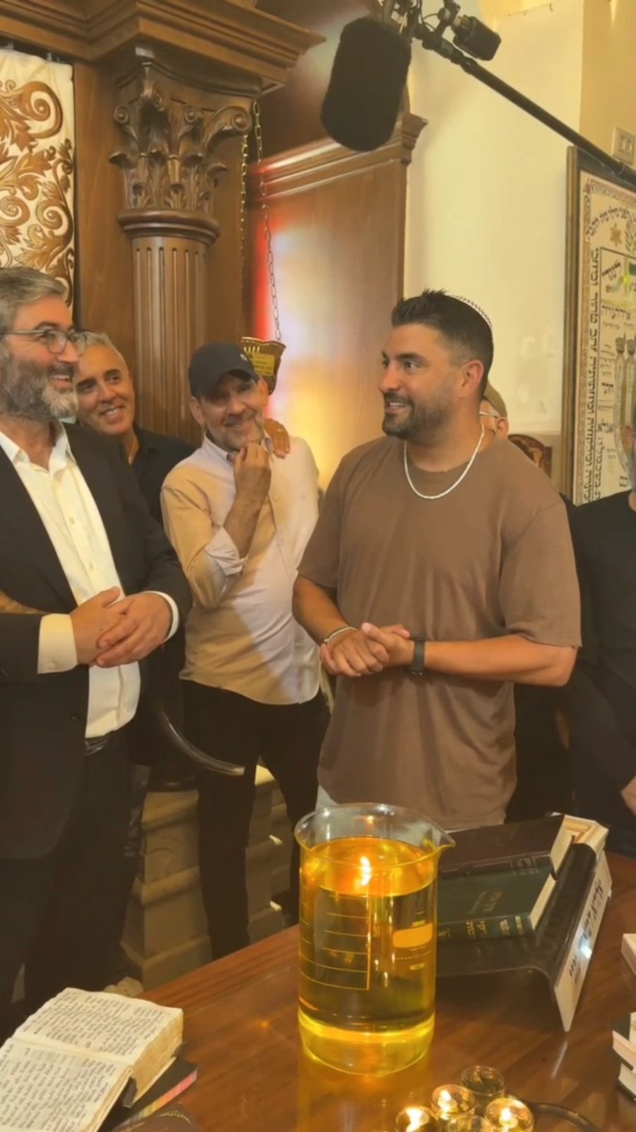 לאחר מכן ראינו את מוטי רבינוביץ בתדרוך במתחם ההדלקה של הגאון הרב שלום ארוש ראש מוסדות 'חוט של חסד' יחד עם הבן שמעון ארוש והגבאי מיכאל בן אבו.