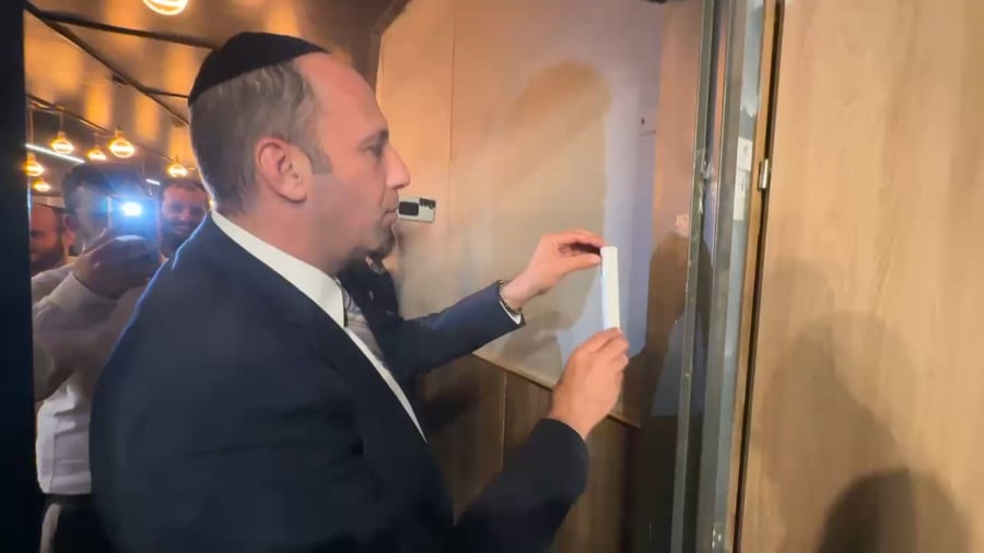 ראש עיריית בית שמש שמוליק גרינברג בקביעת מזוזה במסעדה החדשה של יוסי הופמן סוכן השחקנים החרדים.