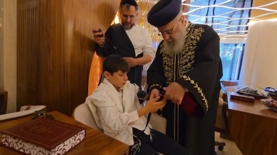 הראשון לציון הגאון רבי יצחק יוסף בהנחת תפילין לנכדו יהודה בן לחתנו הרב ברוך דרעי.