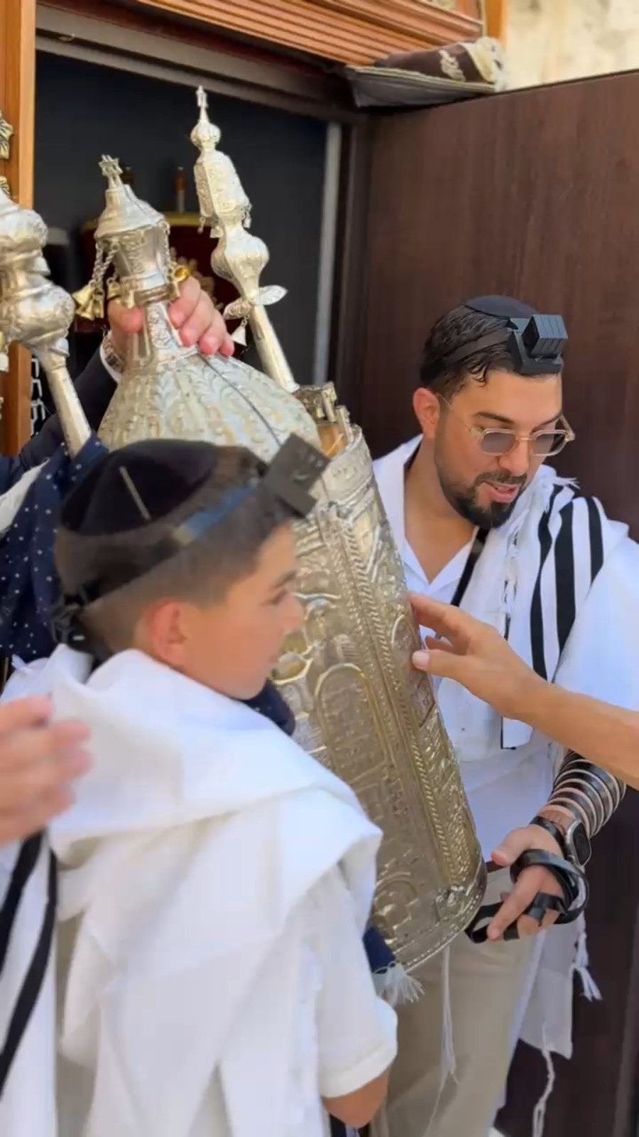 איש העסקים והסלולר נתי תורג'מן בהנחת תפילין לבנו הבכור יונתן בכותל המערבי.