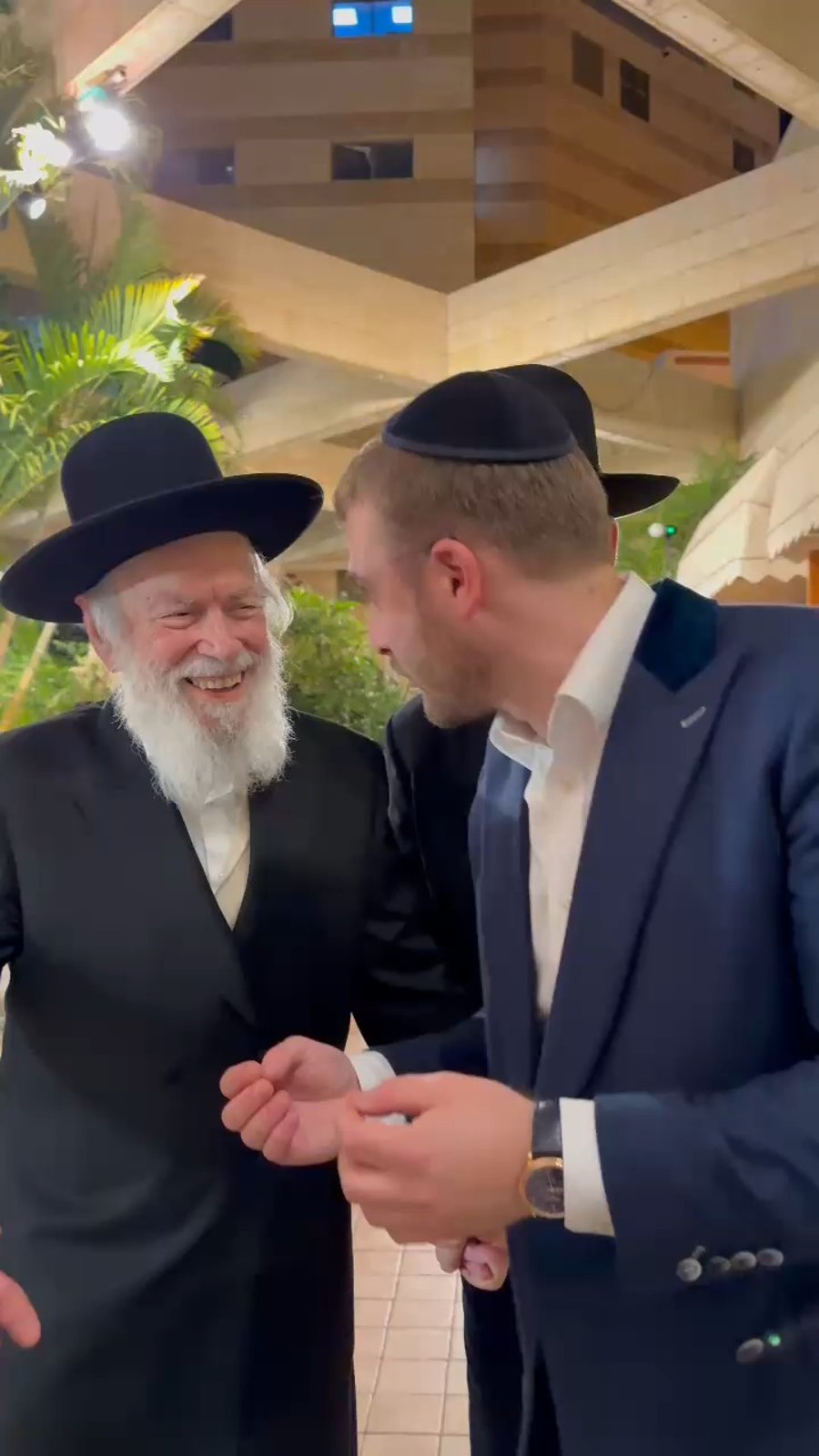 במהלך שמחת השבע ברכות לבתם של איש העסקים מיכאל פינטו ורעייתו השפית מורן פינטו, תפסנו את פרשן 'כיכר השבת' ישי כהן בברכה והתייעצות עם הגאון הרב שלום ארוש מחשובי רבני ברסלב, שאף העניק לו נשיקה.