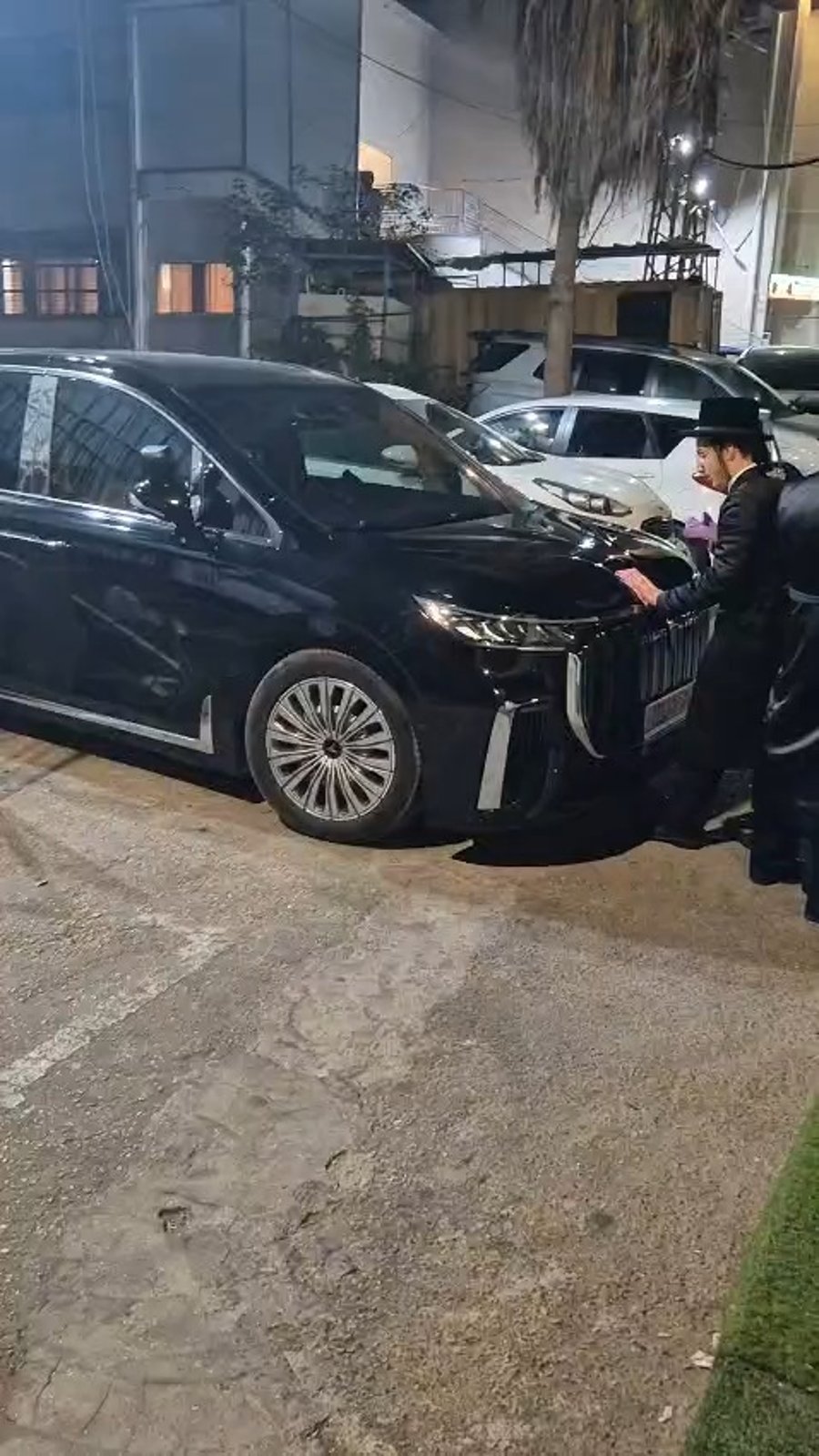 עם בגדי שבת: בחורי ויז'ניץ מרכז הזוכים בזכייה המיוחדת, מנקים את רכבו של האדמו"ר בעדינות ובמומחיות, בחניון אולמי 'היכלי מלכות'.