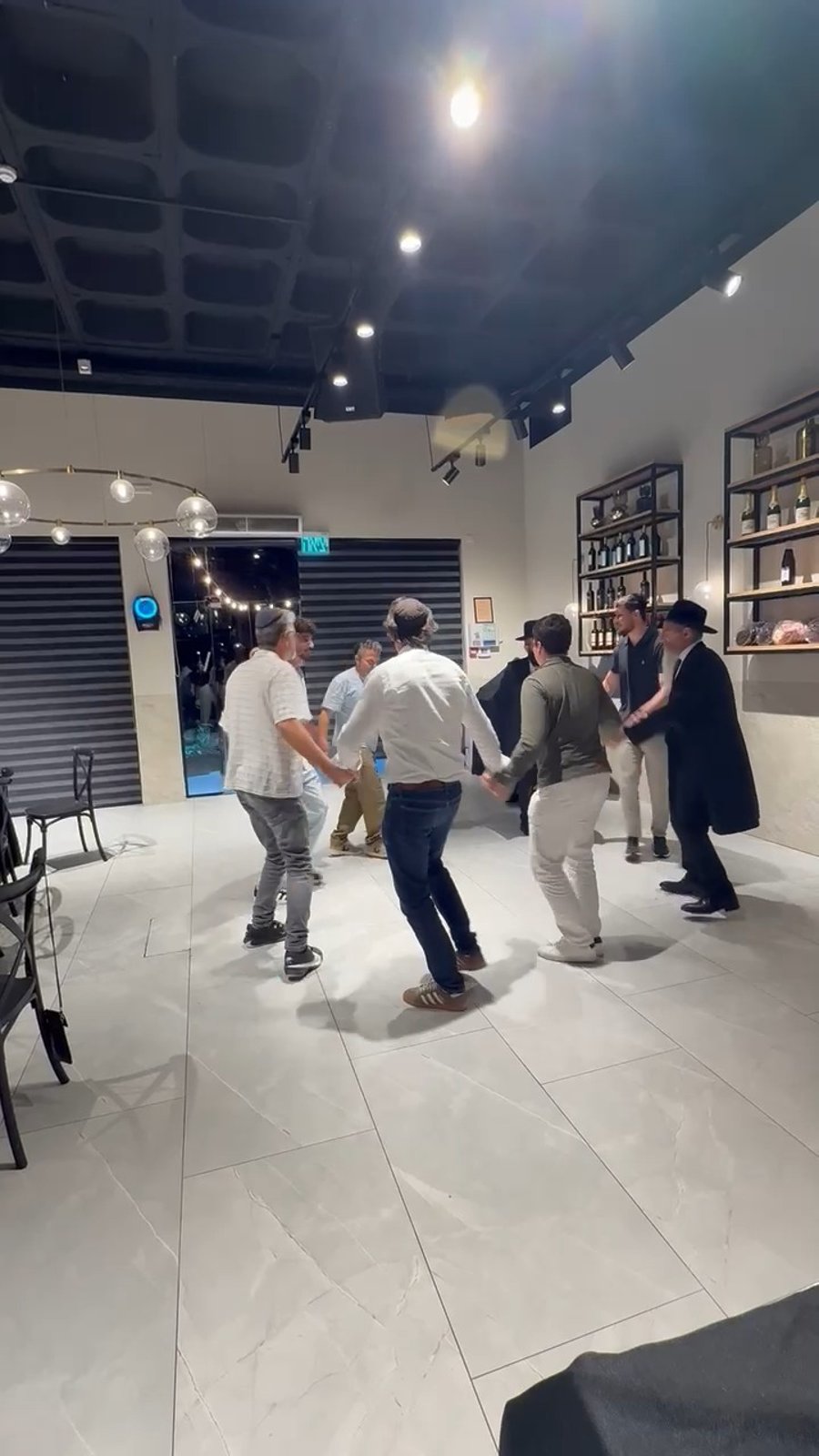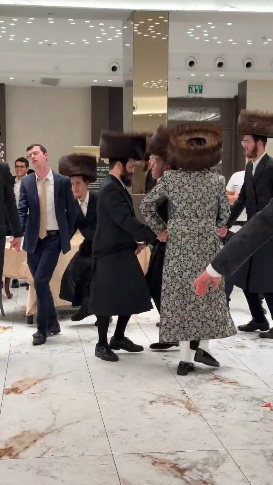 הגאון הרב בערל לאזאר רבה הראשי של רוסיה, בריקוד סוער בשמחת האירוסין לסשה טרופנוב וספיר כהן ששוחררו משבי חמאס, אצל השף אבי מלכא, מהצד נראה המיליארדר יצחק מירילשוילי.
