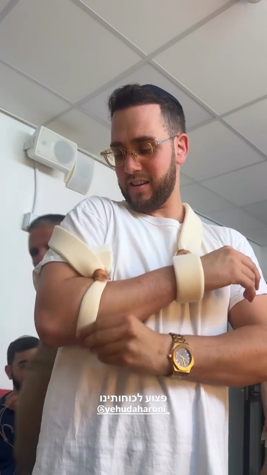 למחרת יהודה אהרוני פרק את הכתף בזמן שלקח את בתו, הוא לא ויתר והגיע להופיע עם קיבוע ביד.