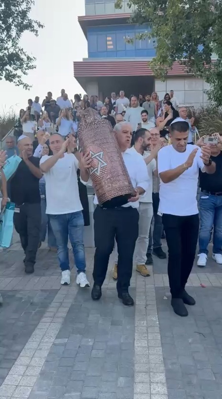 עו"ד משה שמעוני יו"ר דירקטוריון 'רכבת ישראל', בריקוד של שמחה עם ספר תורה שהכניסה הנהלת 'רכבת ישראל', לזכרם של נרצחי מלחמת 'חרבות ברזל' • על החלק המוזיקלי באירוע הופקד הפייטן יניב מדר.