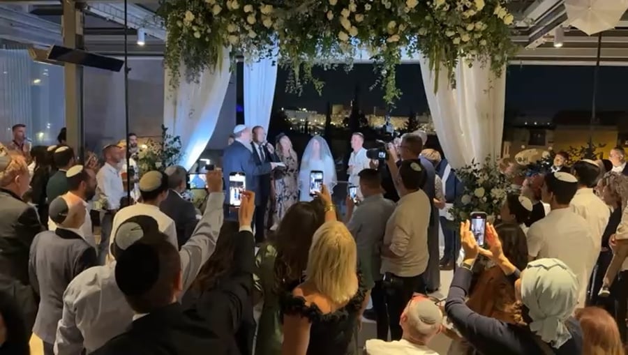 משה ליאון ראש עיריית ירושלים מברך בחופת בתו שיראל, עם נועם מוסקוביץ בנו של תומר מוסקוביץ ראש המועצה המקומית צור הדסה, בחתונה היוקרתית שנערכה במלון 'מצודת דוד'.