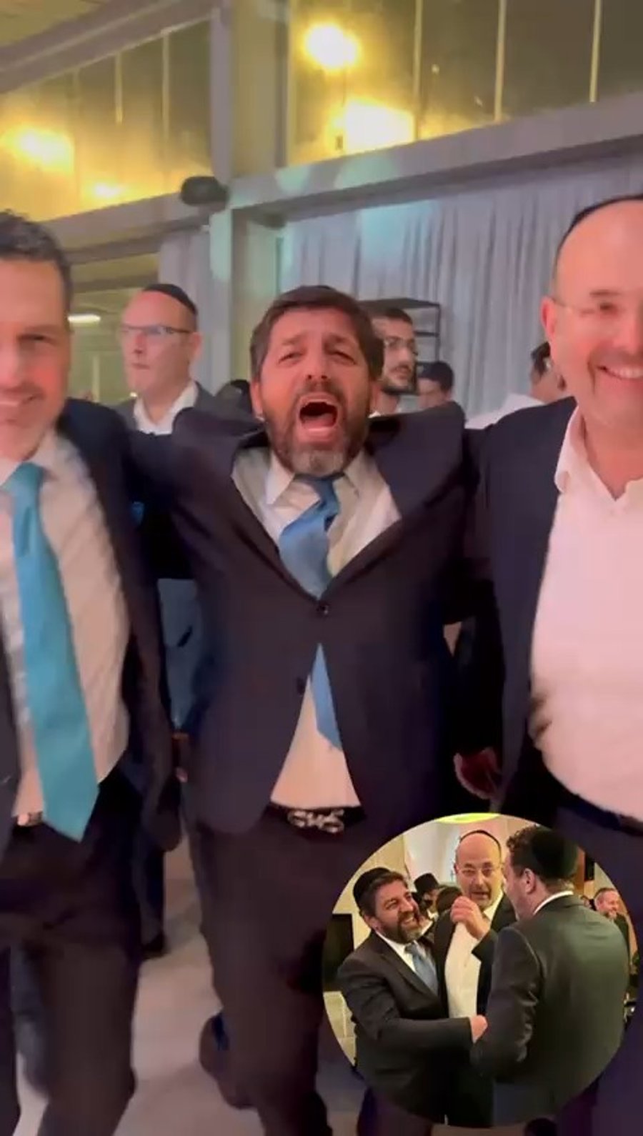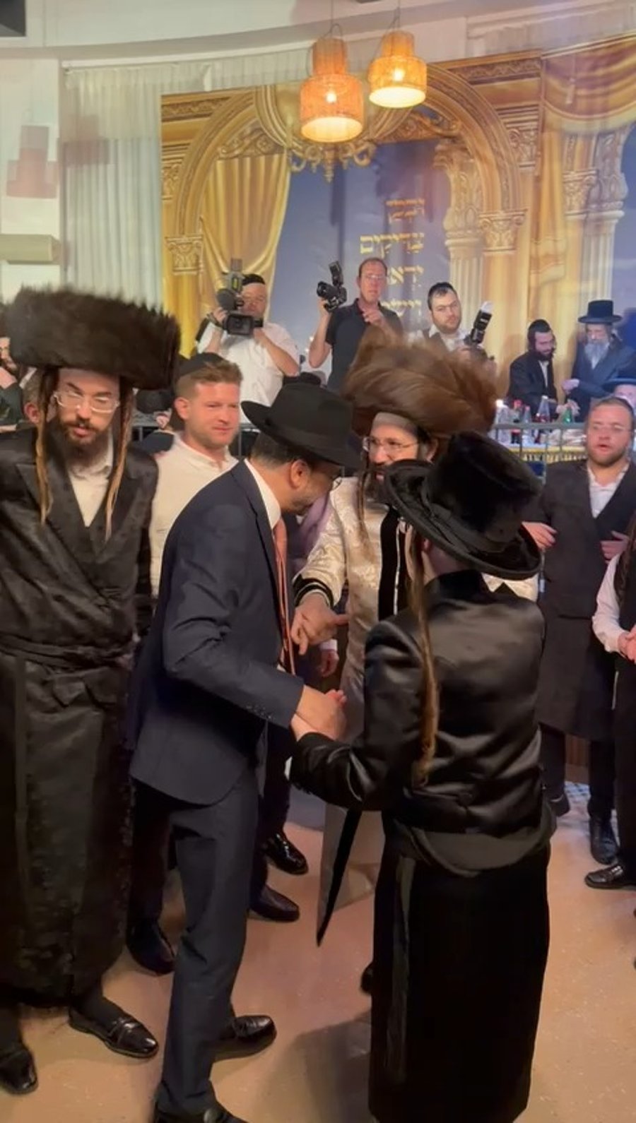 ח"כ אוריאל בוסו בריקוד עם האדמו"ר ממז'יבוז' שחגג בר מצווה יוקרתית לבנו משה, בגן האירועים 'חמישִׁים וֹשְׁמונֶה' בהשתתפות: רבנים, אישי ציבור ואנשי עסקים.