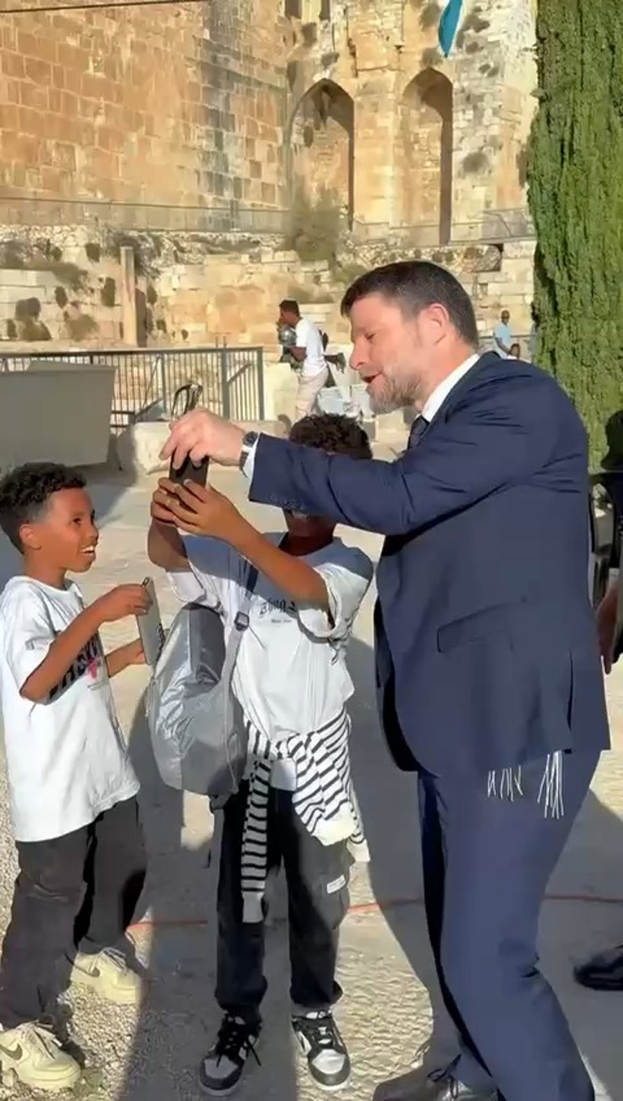 שר האוצר בצלאל סמוטריץ', מסייע לילדים לעשות איתו סלפי, בחגיגות חג הסיגד של הקהילה האתיופית בירושלים.