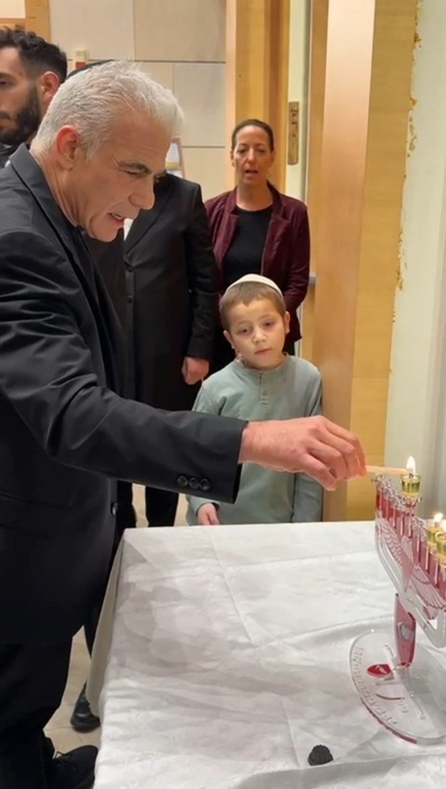 יו"ר האופוזיציה ח"כ יאיר לפיד ורעייתו הסופרת ליהיא לפיד, בהדלקת נרות חנוכה עם הרב יהודה ליפש משלוחי חב"ד בתל אביב.
