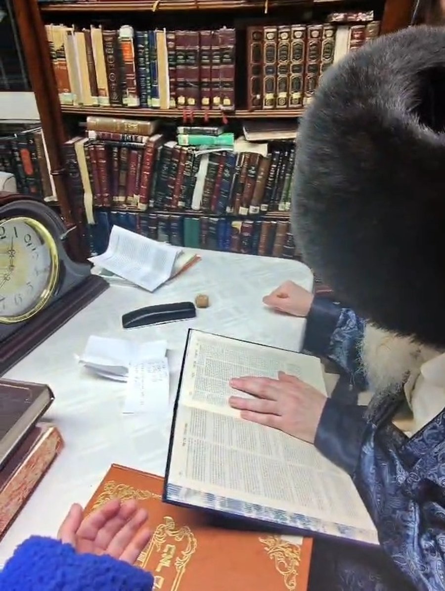 בהמשך נצפה האדמו"ר יושב על כסאו רחוק מעיני הסובבים ומעיין בשקיקה בעלון חסידי.