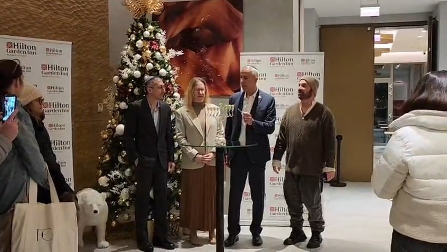 את שי גראוכר, ראינו מזכה את הטסים לחו"ל בהדלקת נרות חנוכה ב'טרמינל פתאל' בנתב"ג עם כובע ומעיל.