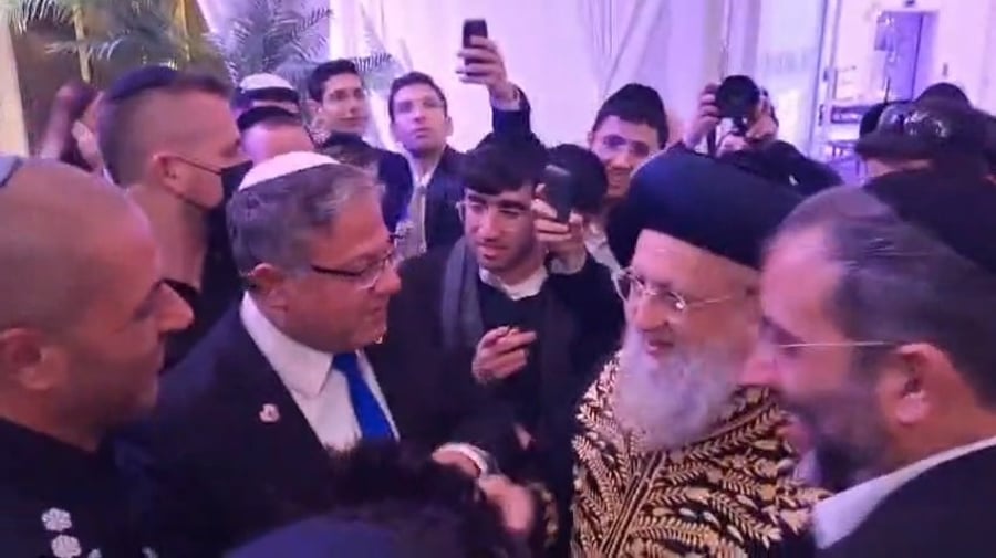 השר לביטחון לאומי איתמר בן גביר ונציב שירות בתי הסוהר רב גונדר קובי יעקובי, מתברכים מהראשון לציון הגאון רבי דוד יוסף, בכניסה לחתונת בתו של הגאון הרב יגאל כהן ראש מוסדות 'יביע אומר' וחבר מועצת הרבנות הראשית לישראל, עם בנו של הגאון הרב אליהו שטרית שהיה עוזרו של מרן רבי עובדיה יוסף זצ"ל, באולמי 'אווניו'. "אתם עושים עבודה טובה למען ביטחון המדינה", אמר להם הראשון לציון.