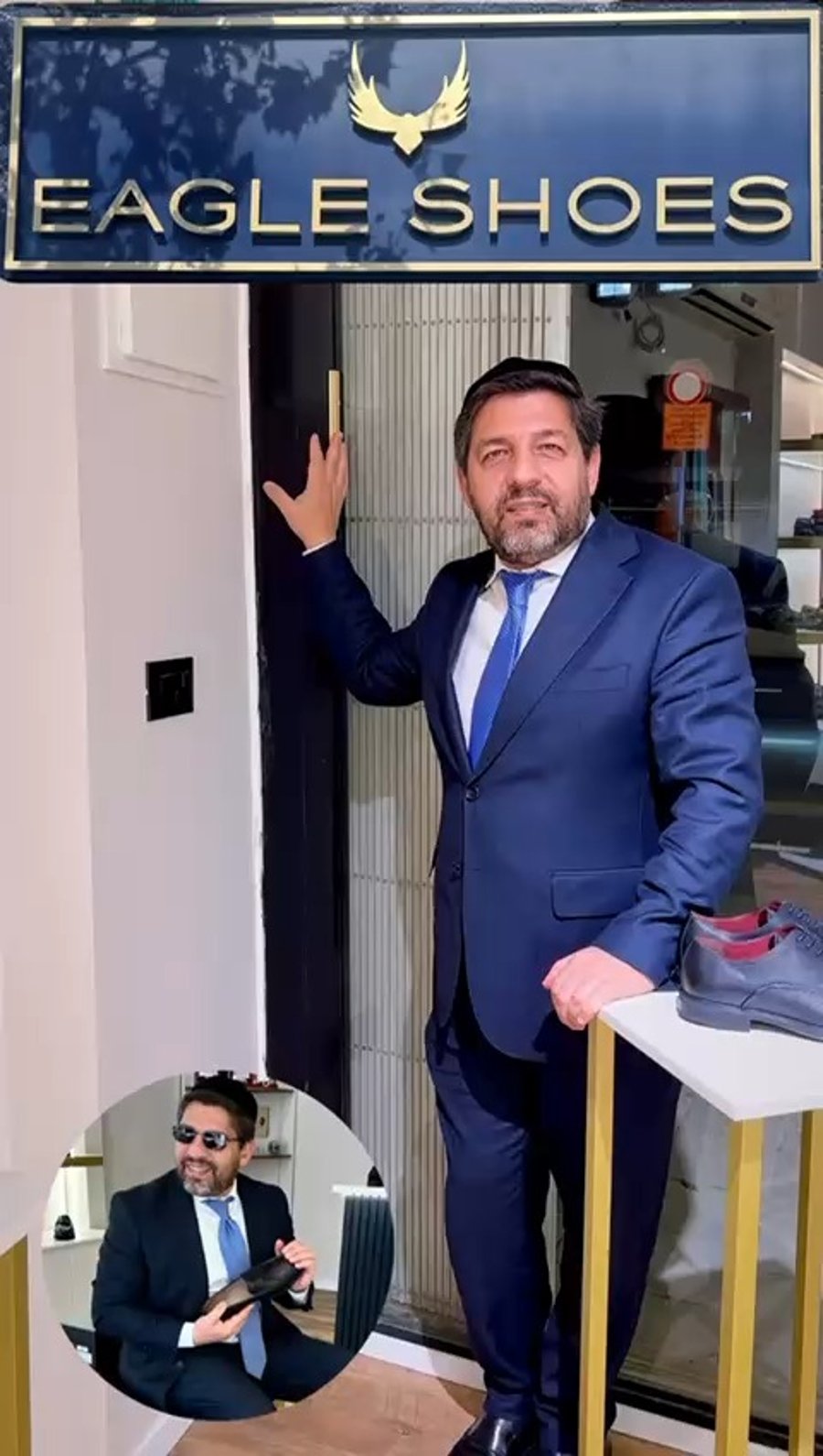 רב הסלבס מרדכי חסידים בקביעת מזוזה בחנות הנעליים היוקרתית 'EAGLE SHOES' בכנפי נשרים 20 בירושלים: "מרכז הנעליים המוביל לבני התורה".