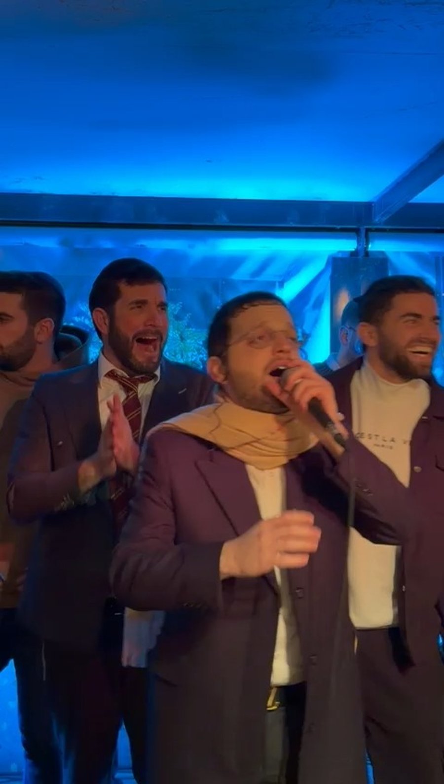 הזמר מרדכי בן דוד ומנהלו האישי זאבי פריד, המפיק שלמה מלול והמוזיקאי יהודה גלילי, באירוע סיום לימוד הרמב"ם היומי ב'בנייני האומה' בירושלים, מאחור נראה המוזיקאי פנחס ביכלר בחזרות עם חברי המקהלה שלו 'מלכות'.