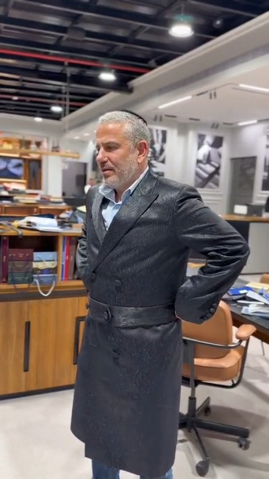 מגיש הטלוויזיה ינון מגל בלוק חסידי עם בעקיטשע לכבוד חג הפורים, אצל המעצב ישראל קויפמן.