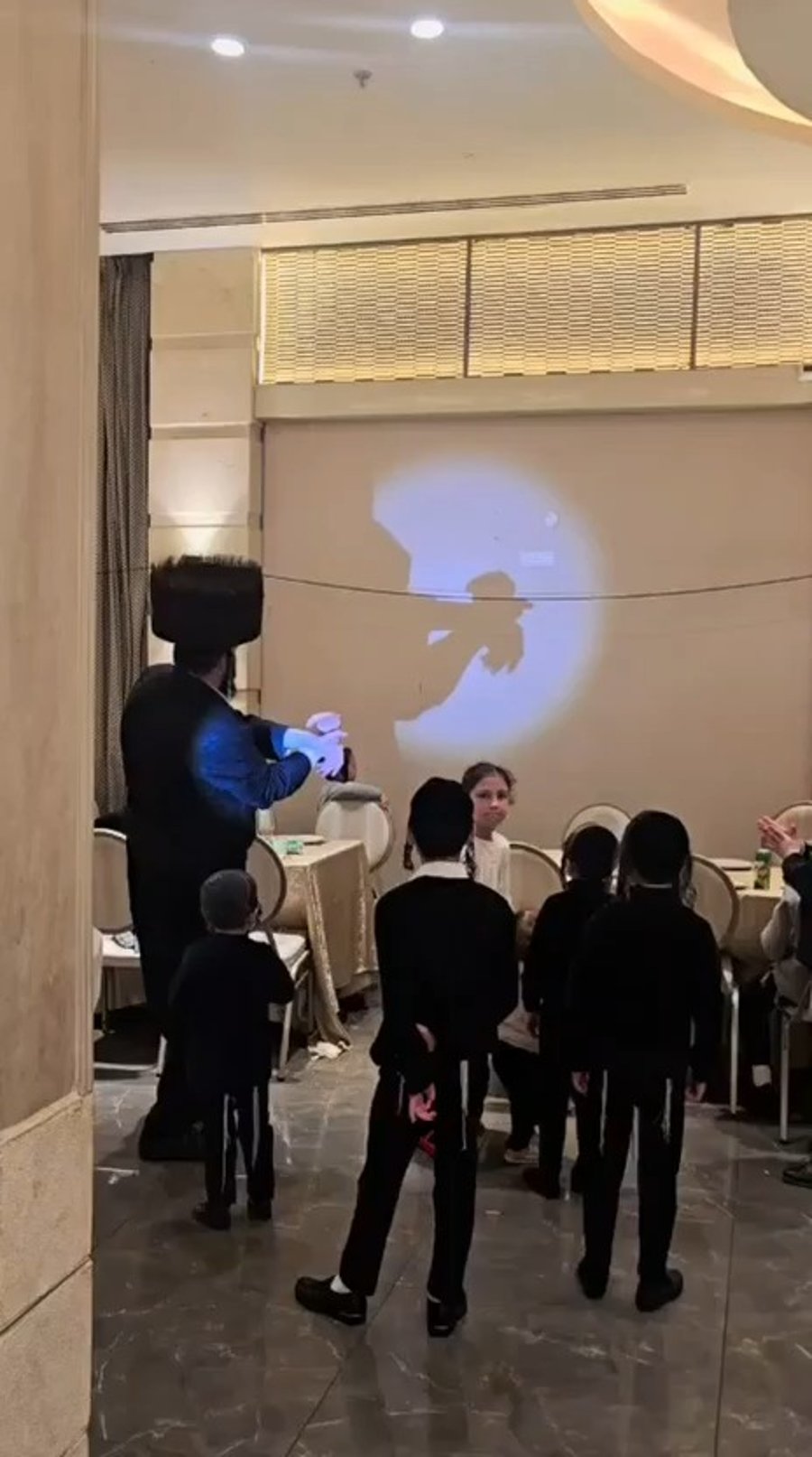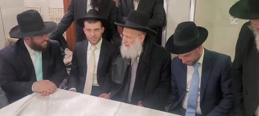 הראשון לציון הגאון רבי דוד יוסף ברגע מאושר של חיבה עם נכדיו, בחתונה משפחתית ב'כתר הרימון' בבני ברק.