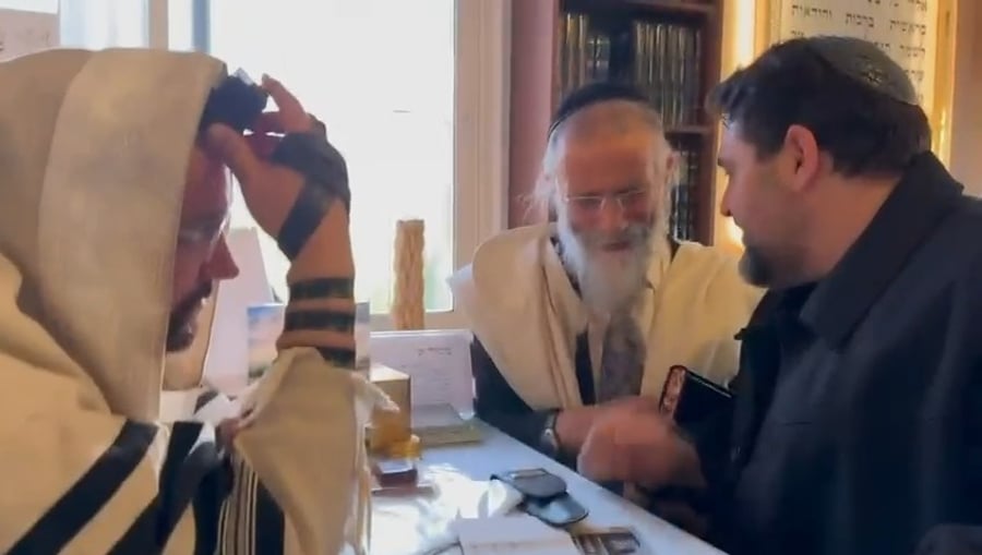 הזמר גד אלבז ומזכה הרבים הרב מיכאל לסרי, מתברכים מהגאון הרב שלמה יהודה בארי - 'הינוקא', לאחר תפילת שחרית בבית מדרשו בראשון לציון.