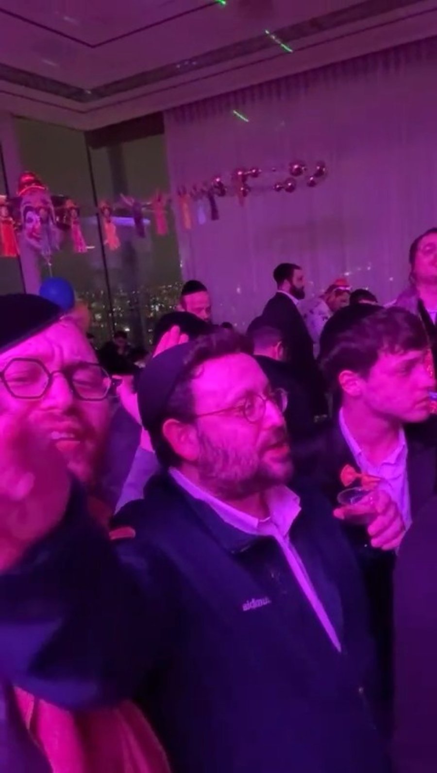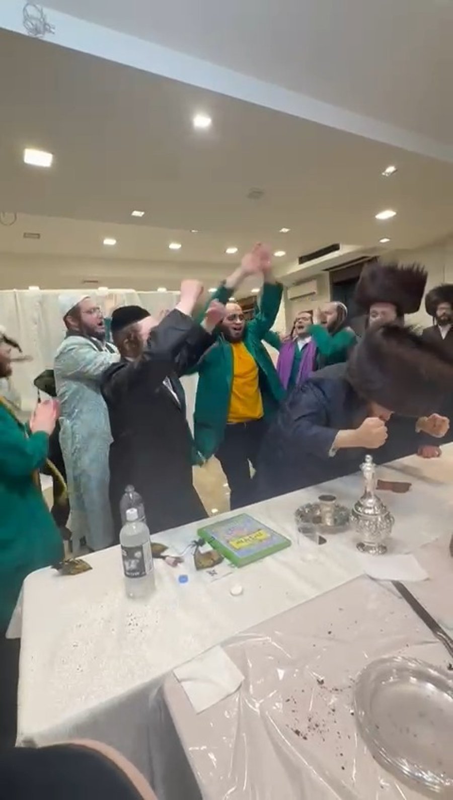 יואלי וייס מנאמני בית האדמו"ר מסאטמר ומגדולי העסקנים בחצה"ק סאטמר, נצפה בריקוד סוער בטיש משתה היין יחד עם העסקן יואלי לאנדא.