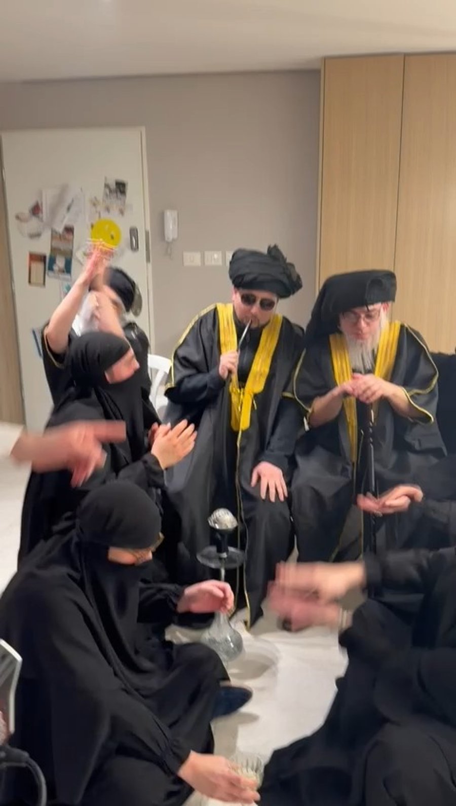 אנשי העסקים, אבי רפול, חיים כהן, שמחה אברמס, פיני פאלוך, הצלם שלומי כהן והמפיק אייזיק גפן, התחפשו לקבוצת ערבים עשירים מאיראן במהלך הפורים.