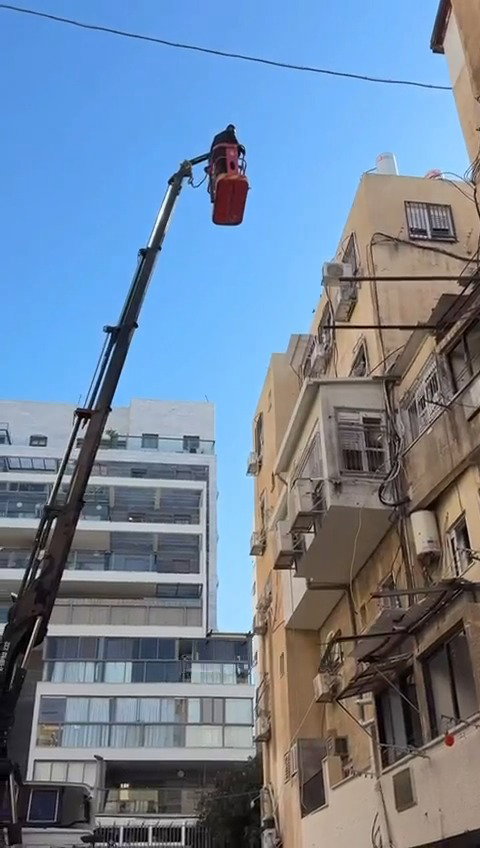 כוכב הרשת דודי קפלר שהגיע לתעד בזירת נפילת הטיל האיראני בשכונת רמת אלחנן בני ברק, עלה על מנוף יחד עם שלמה אלחרר סגן ראש העיר.