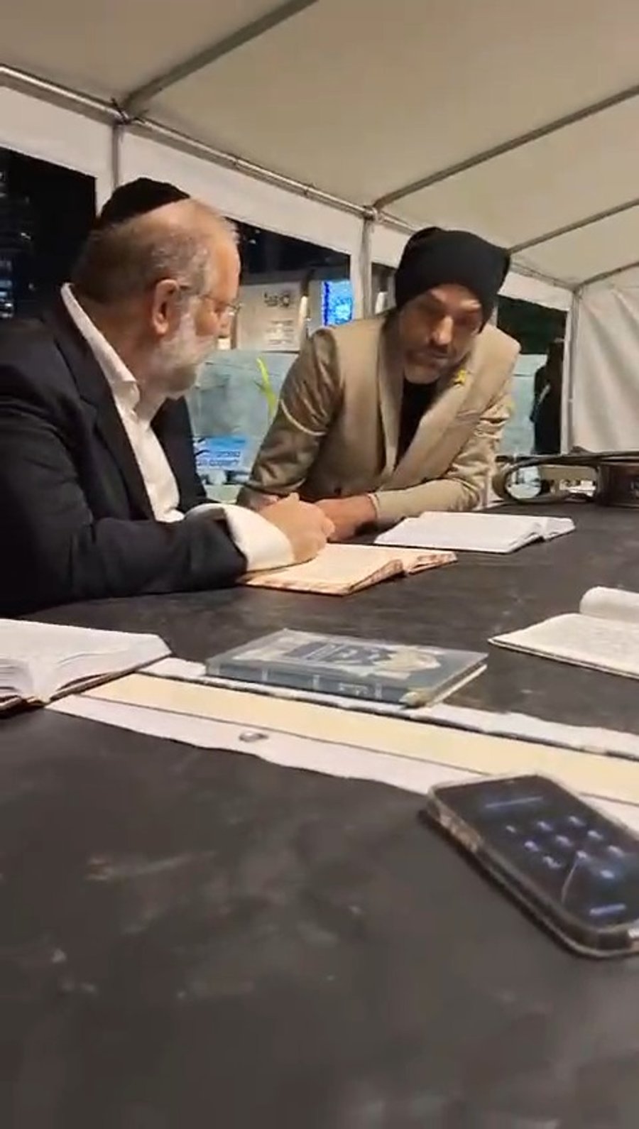הזמר עידן רייכל לומד חברותא יחד עם הרב שלמה רענן, בכולל 'איילת השחר' ב'כיכר החטופים' בתל אביב.