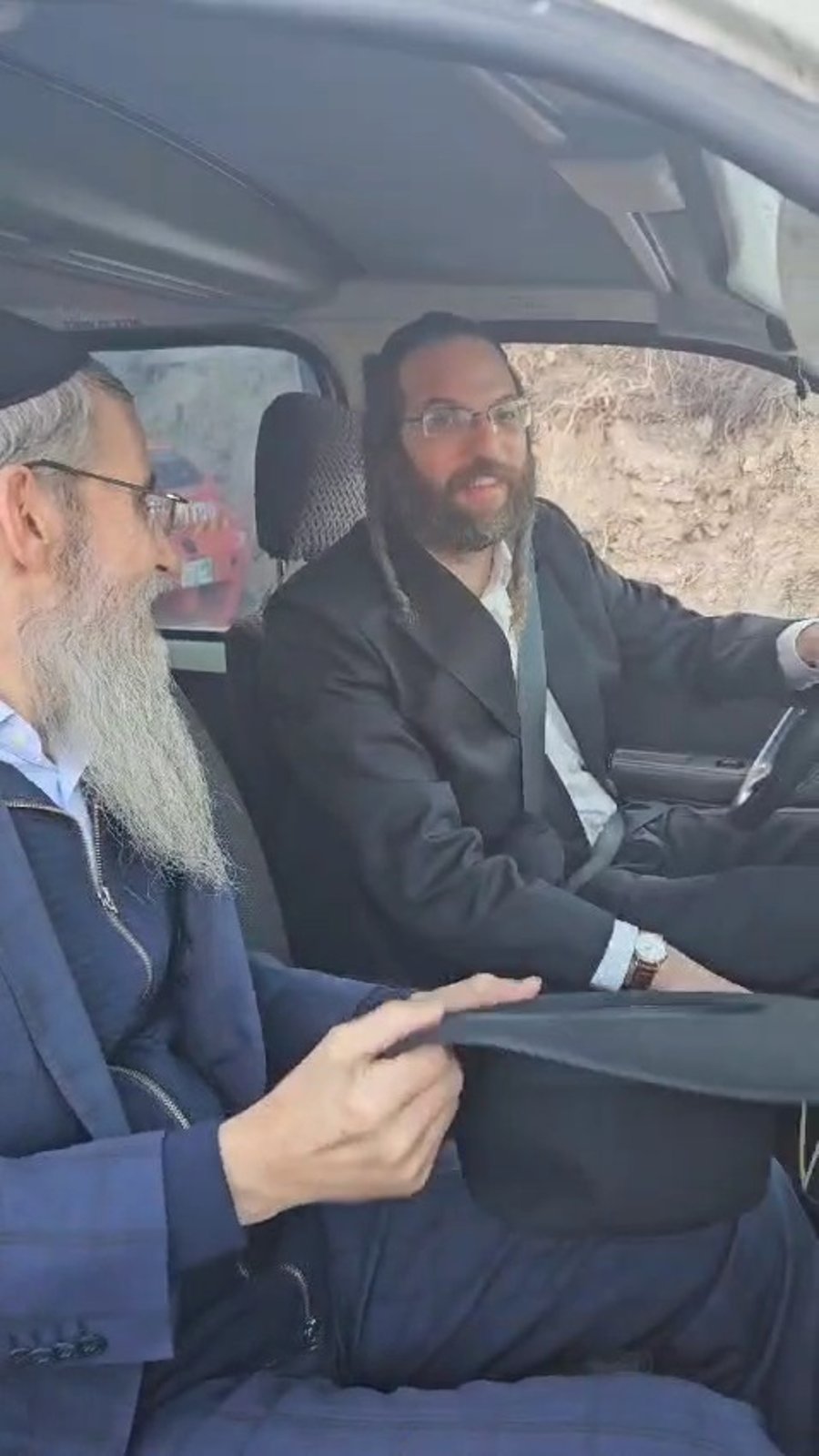 הגאון הרב יצחק דוד גרוסמן רבה של מגדל העמק וחבר מועצת הרבנות הראשית לישראל והמשפיע הגאון הצדיק רבי אלימלך בידרמן, בסוד שיח תורני, ברכבו של איש החסד שי גראוכר בכניסה לאירוע פרטי.