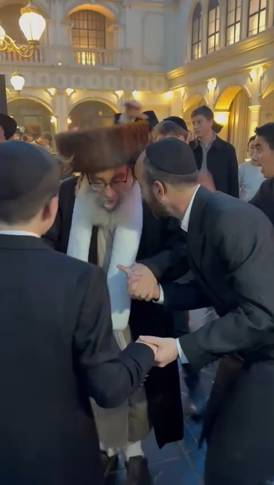 האדמו"ר רבי פנחס אבוחצירא בריקוד של שמחה בהכנסת ספר תורה שערך המיליארדר לב לבייב להצלחת רעייתו אולגה.