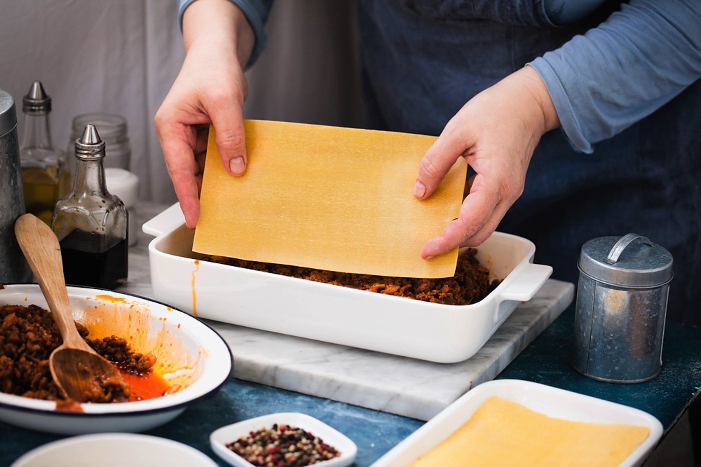 3. בתבנית חסינת חום עם שוליים גבוהים, מסדרים שורה של עלי לזניה, מעליהם מניחים בנדיבות מרוטב הבשר, מכסים בשורה של עלי לזניה, ואז שוב רוטב-בשר ולבסוף עלי לזניה.