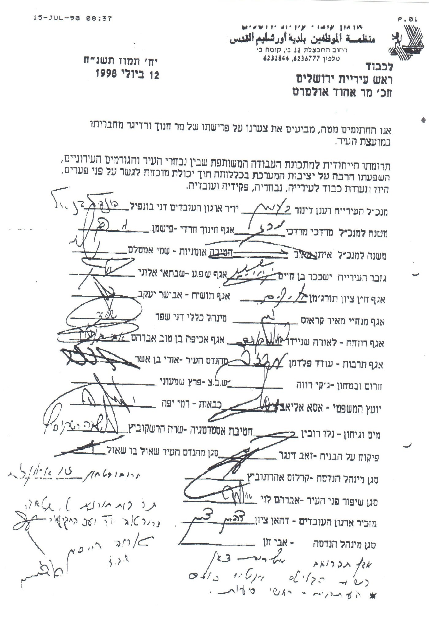 על המכתב חתומים למעלה מ-30 בכירים, כולם גורמי מקצוע, וביניהם, כמה מהדמויות ההיסטוריות בעיריית ירושלים, כגון, רענן דינור, מנכ"ל העירייה דאז ולימים מנכ"ל משרד ראש הממשלה, מרדכי מרדכי, המשנה למנכ"ל דאז ולימים מנכ"ל משרד הבינוי והשיכון ובשורה ארוכה של משרדים נוספים, ועוד. ב'טוב לירושלים' מפרסמים היום את המכתב על רקע ניסיונם של נציגי 'יהדות התורה' להטיל ספק ביכולת פעולתו של ורדיגר כחבר במועצת העיר.