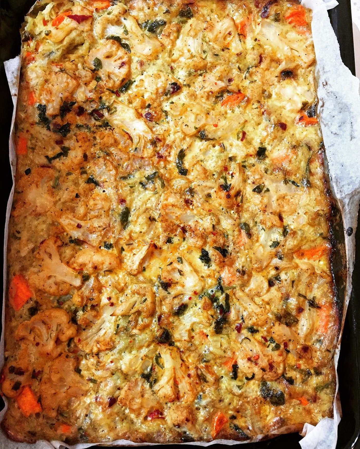 2. בקערה גדולה, מערבבים את תפוחי האדמה עם הבטטות, הבצל המטוגן (יחד עם השמן שבמחבת). מוסיפים את הפטרוזיליה והביצים, מתבלים בכורכום, מלח ופלפל שחור, ממשיכים לערבב לשילוב מלא ויוצקים את התערובת לתבנית מרופדת בנייר אפיה.