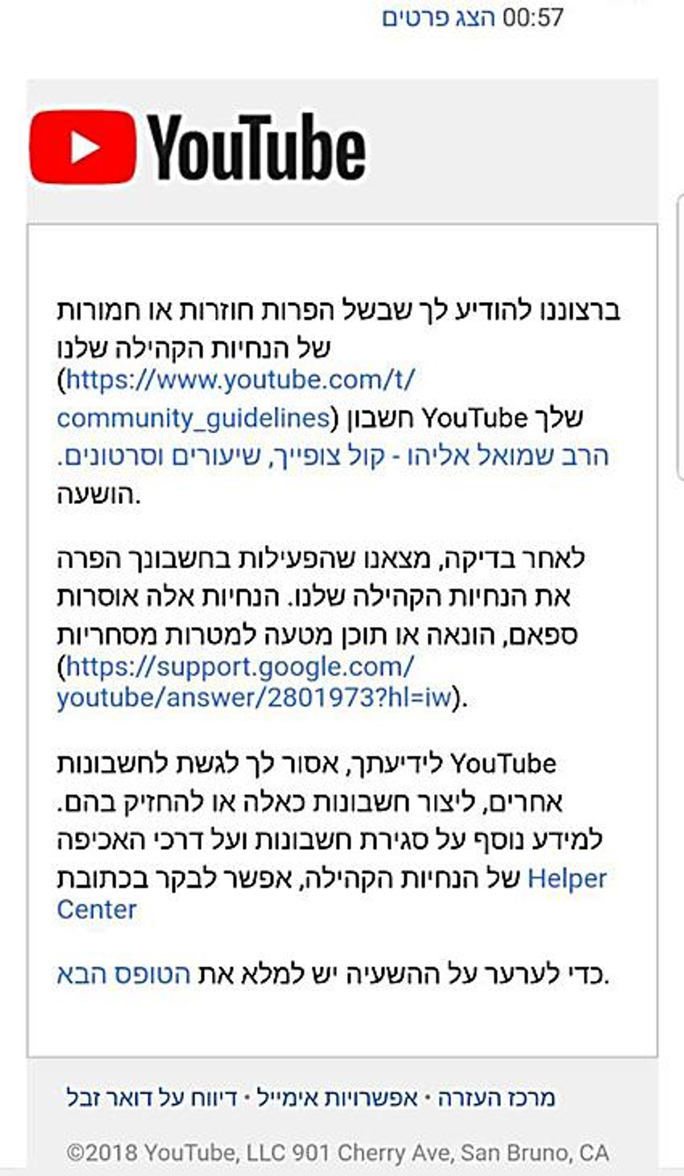 לדבריהם: "חשבון היוטיוב נחסם - הן לצפיית הגולשים והן לניהול עד ידי אנשיו של אליהו, מבלי שהאחרונים הוזהרו על כך וללא פירוט העבירות שהביאו להשעיה".